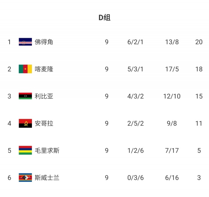 世预赛仅剩最后一轮,佛得角仍2分领跑,下轮面对小组垫底的斯威士兰,赢球即可确保队史首次晋级下一轮 世界杯赛 ;喀麦隆第2追赶 2分,但握有7个净胜球优势。