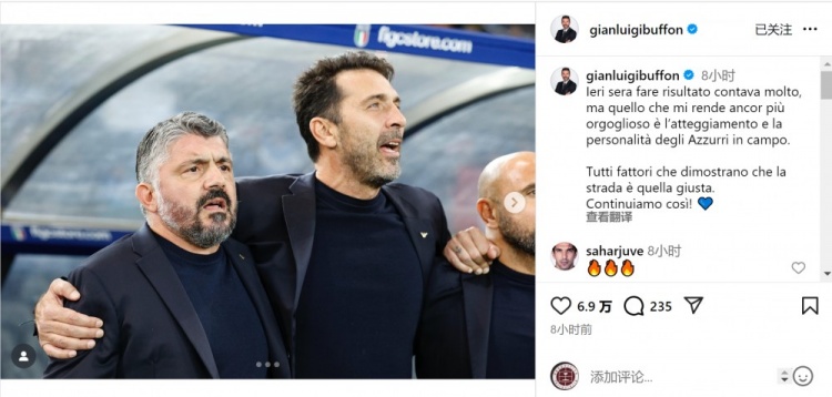 意大利国家队领队布冯社媒晒出与主帅加图索的合照,欧联杯在线直播免费观看并写道:“昨晚赛事 的结果非常重要,但更令我自豪的是蓝衣军团在赛场上展现的态度和个性。”