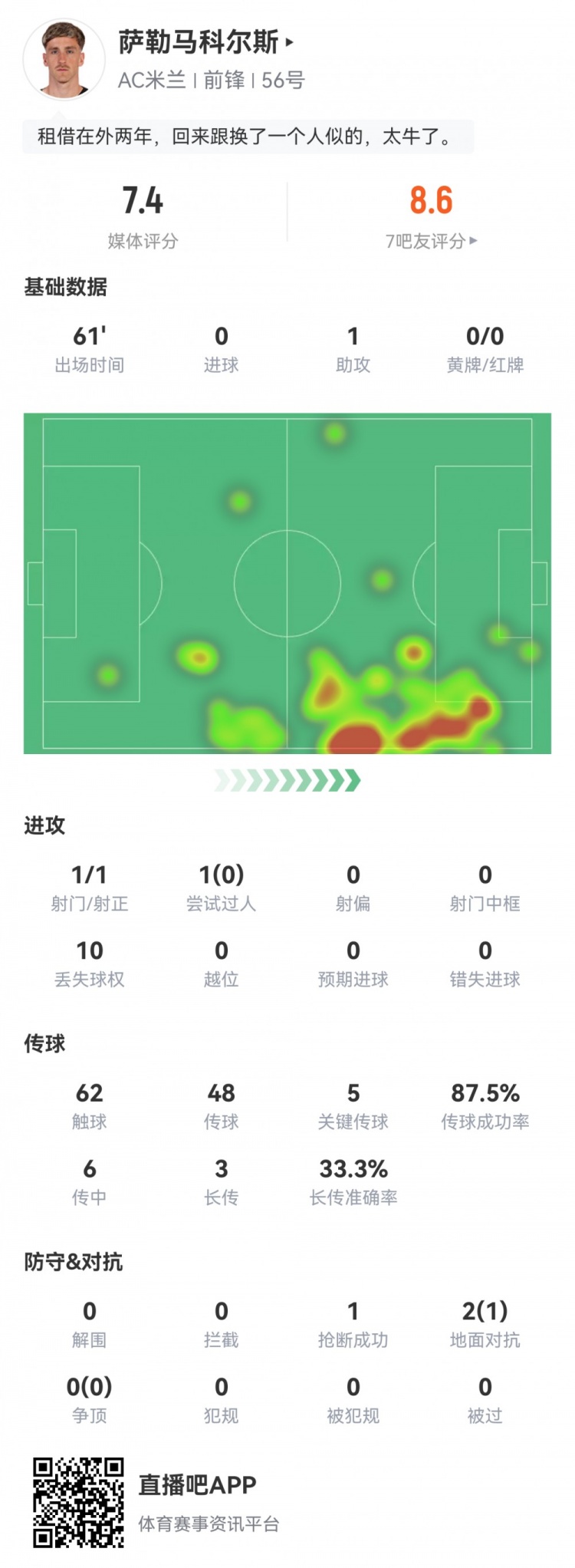9月24日讯 意杯第二轮,米兰3-0领跑 莱切。此役萨勒马科尔斯杆位61分钟被换下,欧洲杯直播吧球员全场重积分 据如下↓