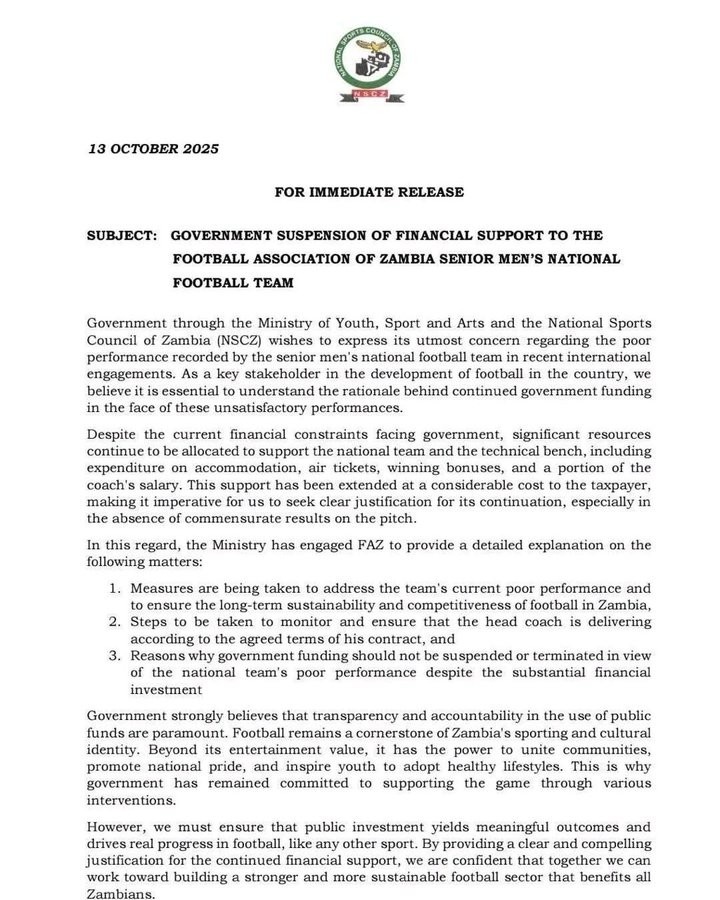 赞比亚青年、体育与艺术部及国家体育委员会联合发布的声明中表示,政府对球队在获得大量资金投入后仍成绩不佳深感忧虑。该部门指出,他们已动用巨额公共资金,为国家队支付住宿、机票、获胜奖金及指导教练员部分薪资。