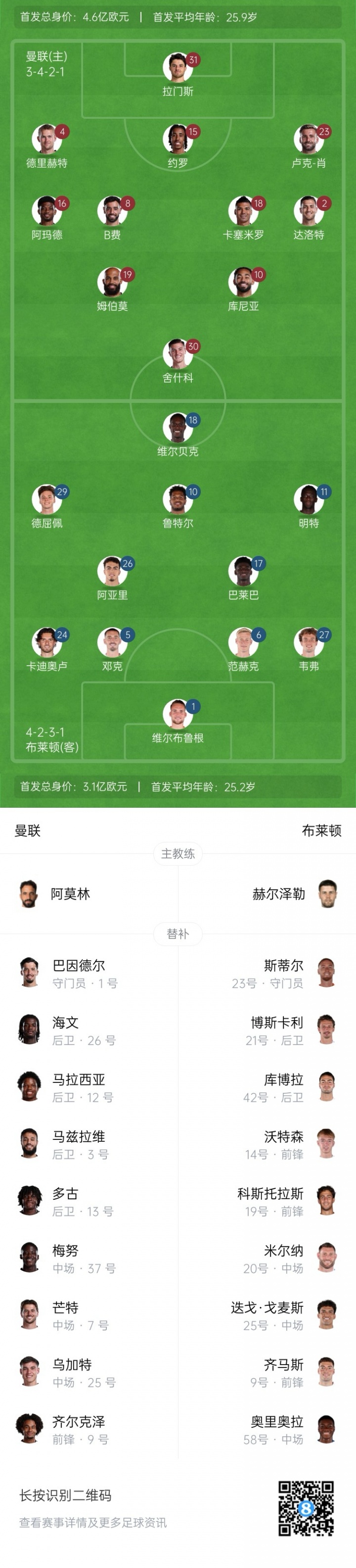 曼联杆位:31-拉门斯、23-卢克·肖、4-德里赫特、15-约罗、2-达洛特、18-卡塞米罗、8-B费、16-阿玛德、10-库尼亚、19-姆伯莫、30-舍什科