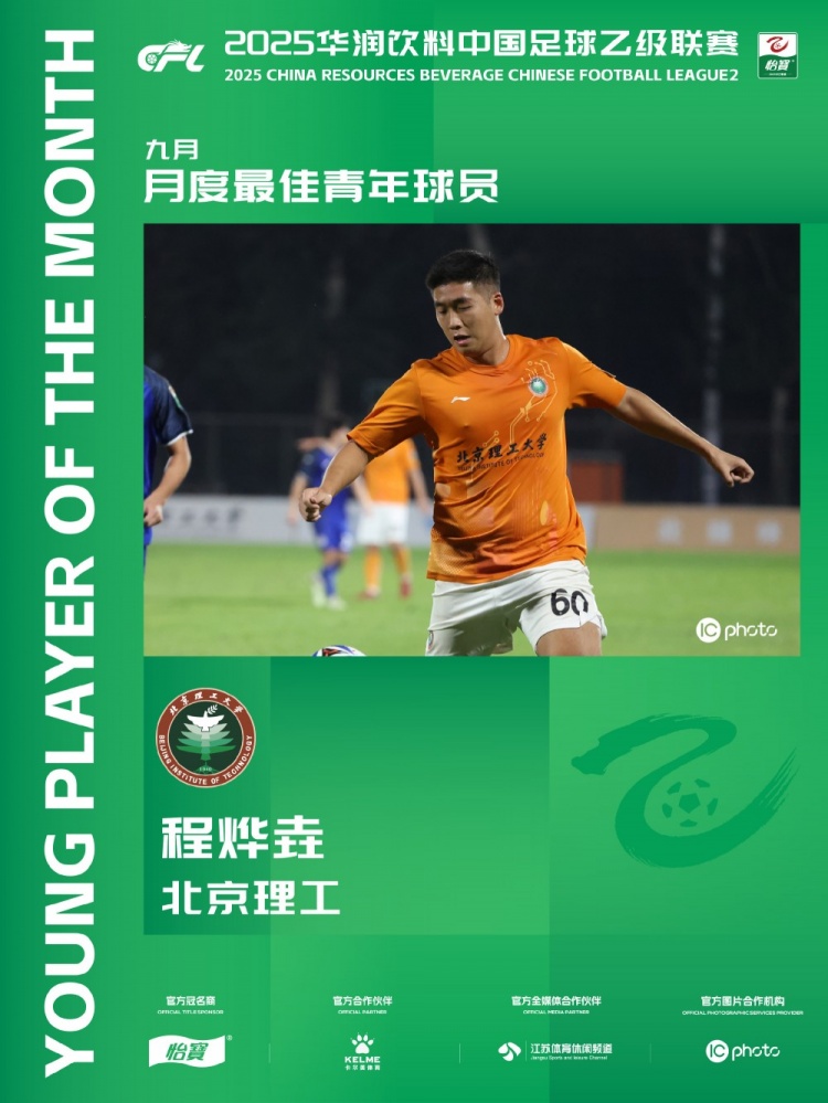 10月31日讯 中乙职业联赛 官方公布了9月最佳青年球员,北京理工球员程烨垚当选,他在9月出场4次打入3球并送出2次助功 。