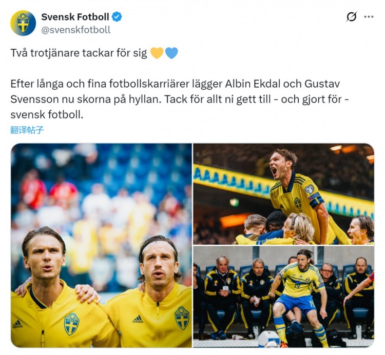 11月11日讯 前瑞典国脚埃克达尔、古斯塔夫·斯文松退役,瑞典足协社媒发文感谢他们的贡献。