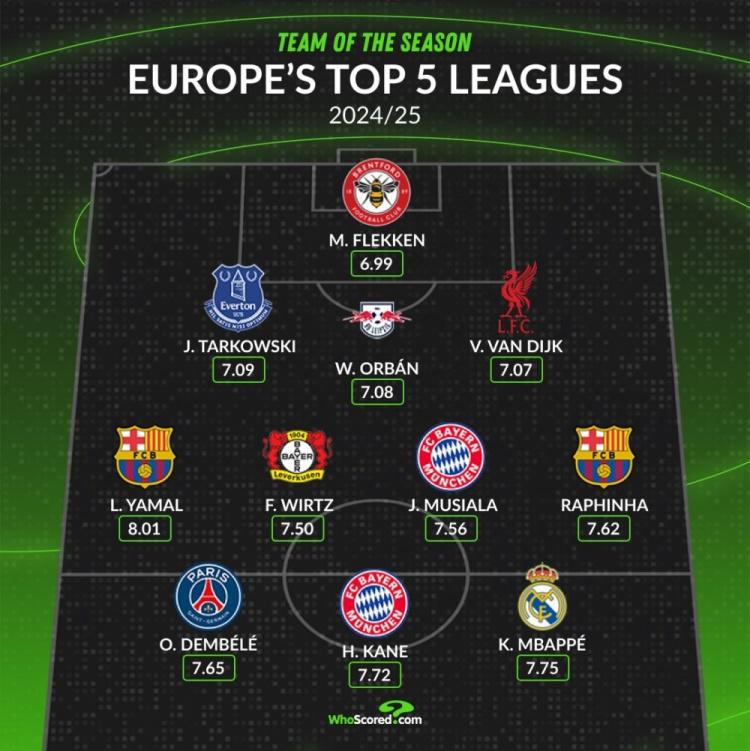 亚马尔打出了现象级的表现,这一点不用多说。他在五大职业联赛 层面就是最出色的前场球员之一,入选实至名归。最后,再来看锋线。五号位位置给到了拜仁球星哈里凯恩,他上赛季的综合评分为7.72分。凯恩终于打破了多年没有第一名 的魔咒。并且在拜仁维持着不错的得分 效率,这是他能够上榜的原因。对于五号位这个位置上来说,现如今比他出色的球员屈指可数。而两个翼锋的位置,则是分别给到了大巴黎前场球员登贝莱以及皇马的。登贝莱现如今是金球奖第一热门,他上赛季在巴黎获得了7.65的综合评分。