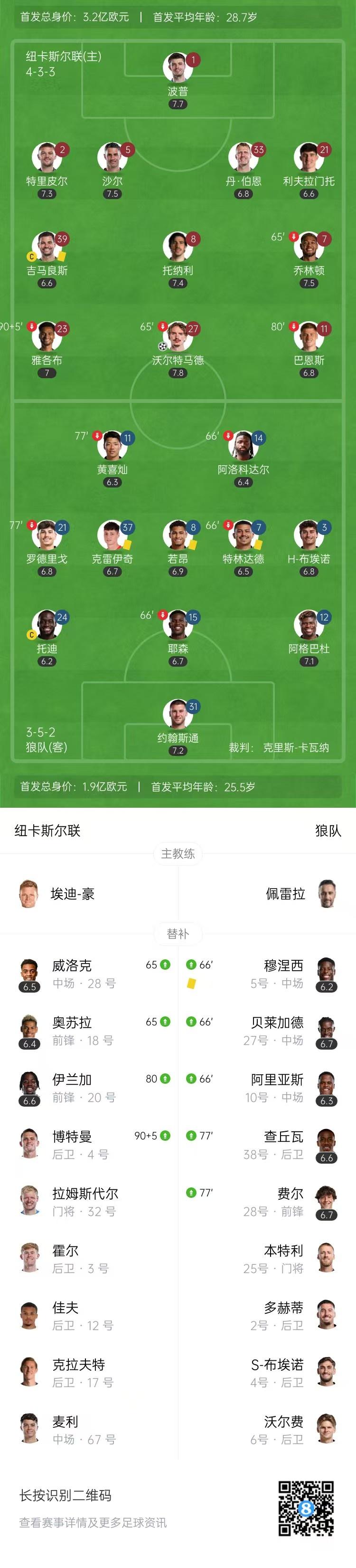 全场赛事 结束,纽卡斯尔联1-0狼队。