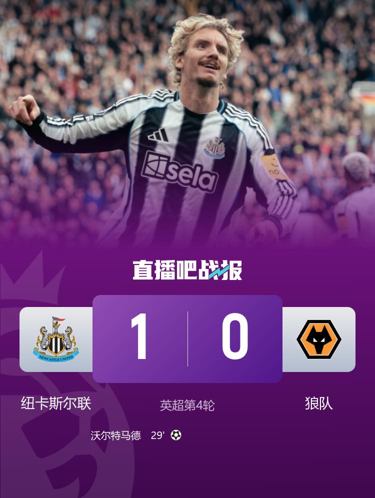 第29分钟,纽卡右路送出传中,沃尔特马德顶球抢点破门,纽卡斯尔联1-0狼队。↓