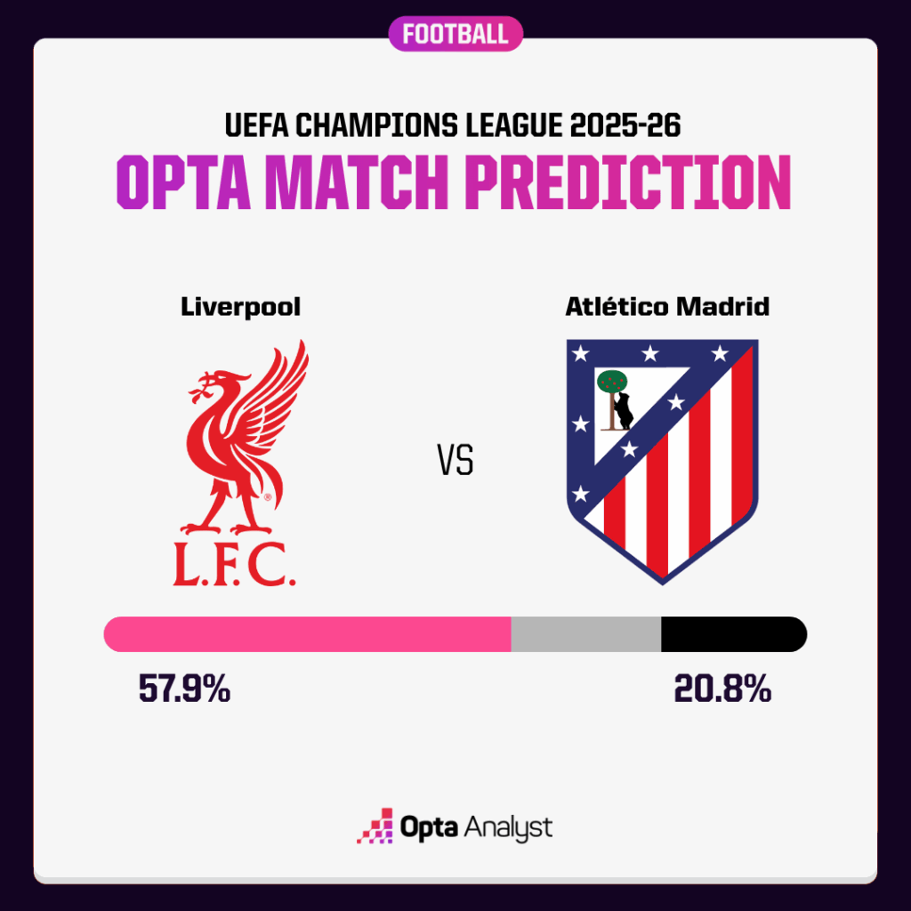 Opta超级计算机将利物浦列为击败马竞的大热门,斯洛特的球队在赛前模拟中胜率高达57.9%。两队历史交锋记录平分秋色,在8次交手中各胜3场。