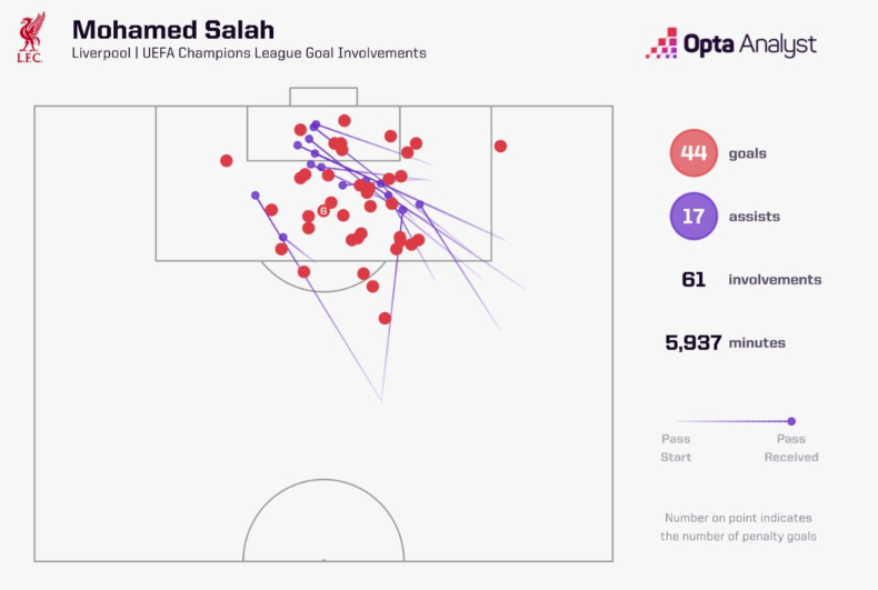 萨拉赫以44个得分 和17次助功 成为利物浦队史欧冠赛场加入 得分 最多的球员。
