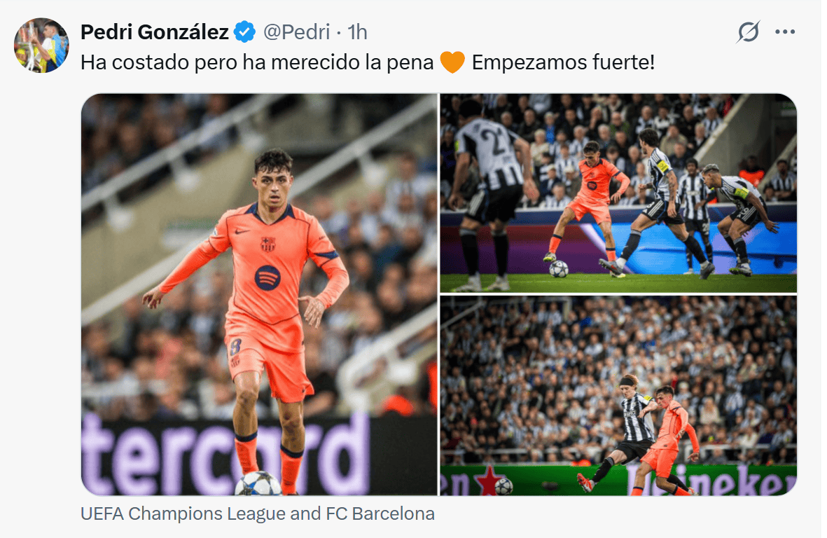 佩德罗在社媒中这样写道:“赛事 过程虽然不容易,但一切都值得,我们收获了强势开局!”