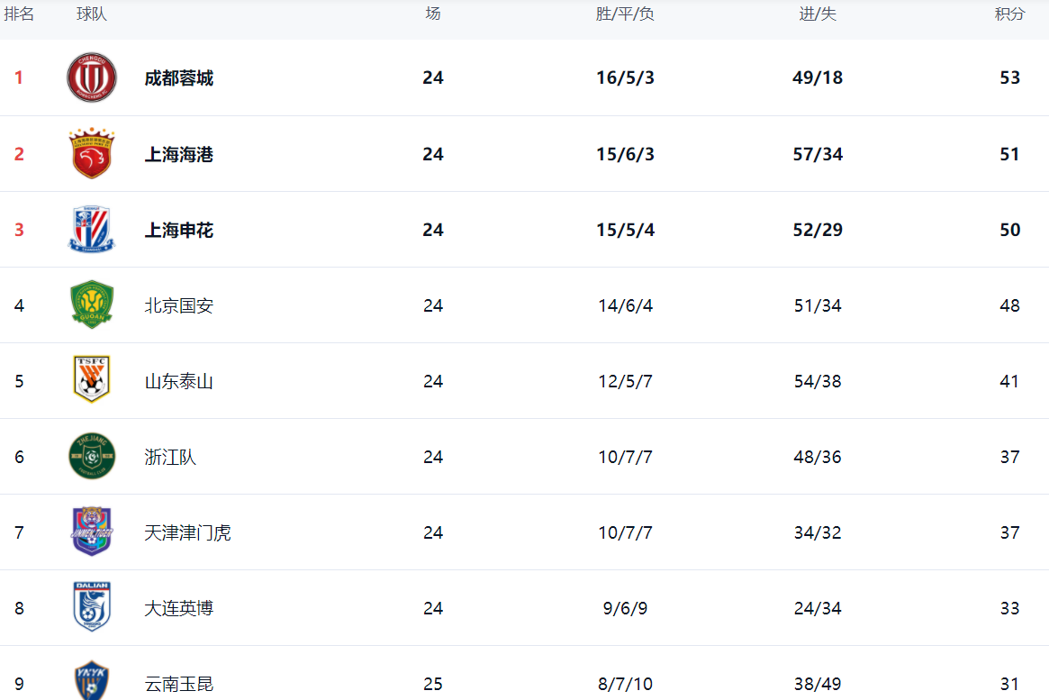 在积分榜上,成都蓉城以53分排名榜首。第2名的是上海海港,拿到了51分。上海申花以50分紧随其后。至于北京国安,就有点掉队了,只拿到48分,排名第4。山东泰山41分排名第5。浙江队和天津津门虎都是37分。大连英博33分足球新闻头条,排名第8。云南玉昆31分,排名第9。