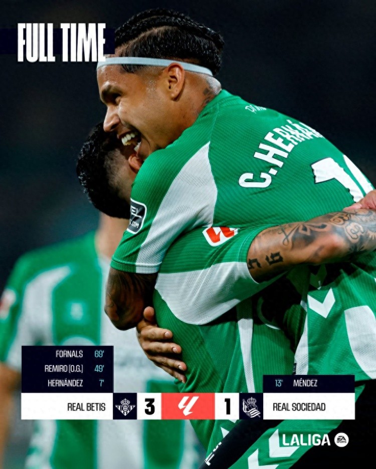 全场赛事 结束球友体育直播在线看网页,最终贝蒂斯3-1战胜皇家社会。