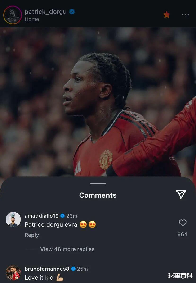 赛后,队友阿马德·迪亚洛第一时间在多古的Instagram下留言互动。多古写道:“又朝着正确方向迈了一步。”阿马德回复:“Patrice DorguEvra(帕特里斯··多古·埃弗拉)”,把这位左翼卫与曼联传奇埃弗拉相提并论。领队 B费也留言:“爱死你了,小子”,感谢了他的顶球助功 。