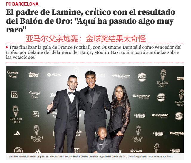 2025年金球盛典,巴黎圣日耳曼的登贝莱加冕金球,巴萨的亚马尔排名第2位。在大多数人看来足球新闻头条,登贝莱获奖实至名归,不过,亚马尔的父亲穆尼尔-纳苏鲁伊(Mounir Nasroui)很不满,声称这是“怪事”。