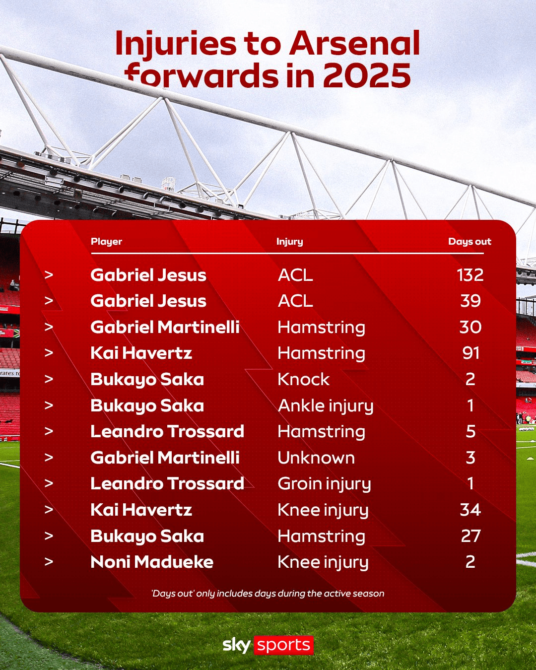 萨卡是2025年负伤 次数最多的阿森纳球员,不过他的三次受伤 时长都不超过一个月。