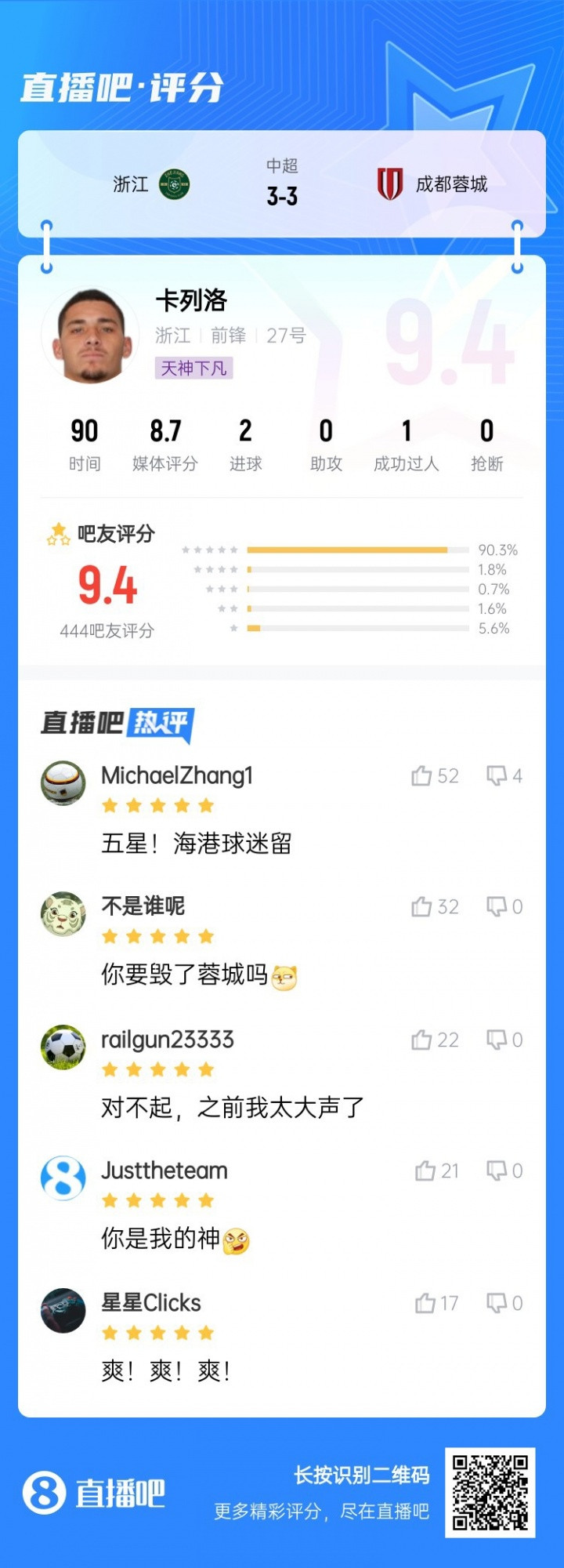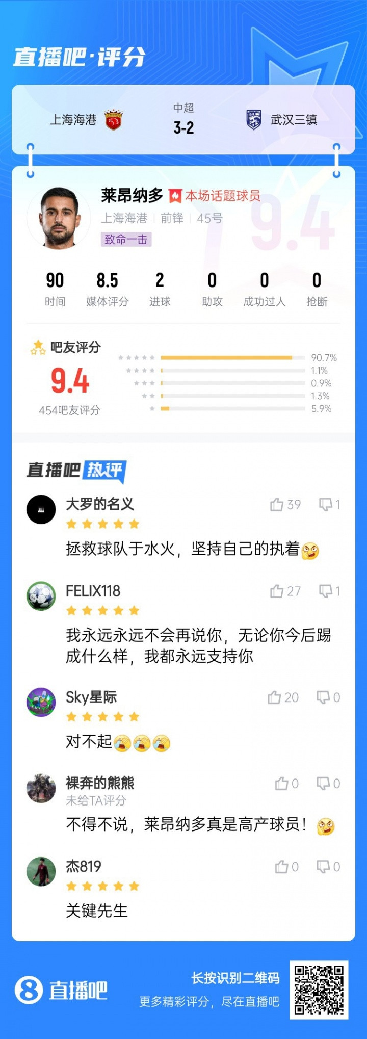 [直播吧]中超第26轮最佳球员评选得票率前三