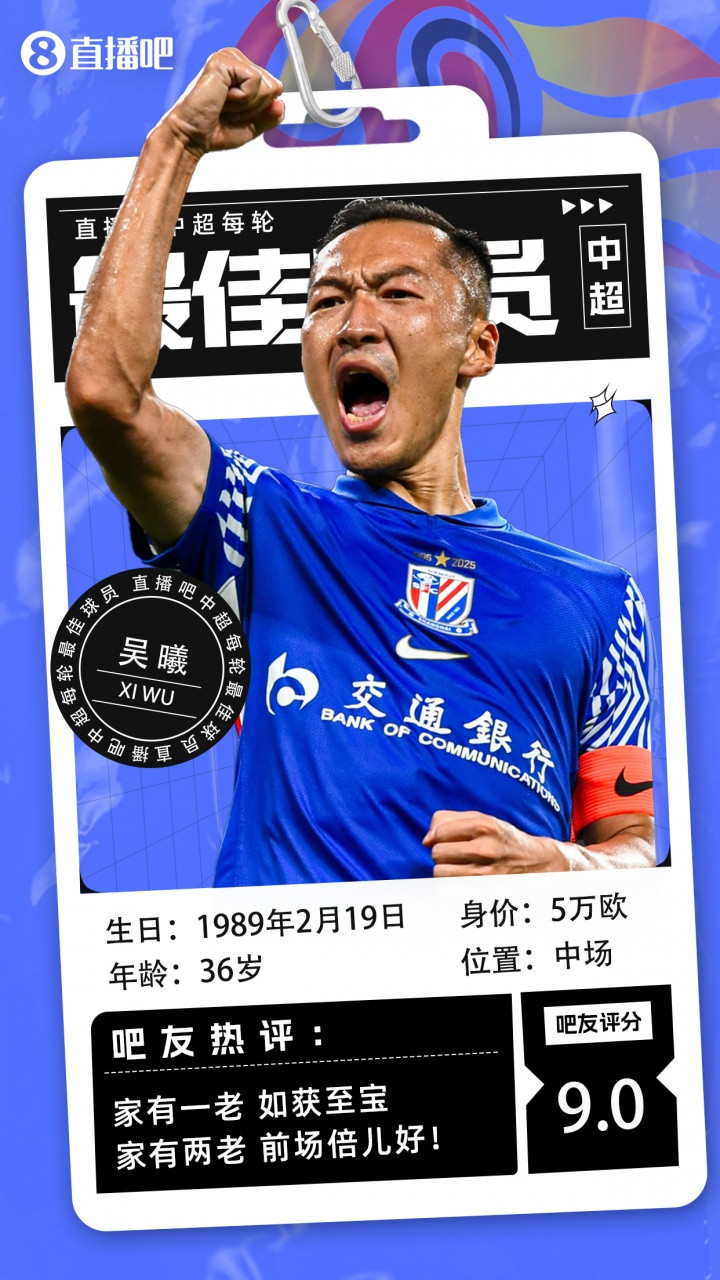 [直播吧]中超第26轮最佳球员评选结果出炉,上海申花领队 吴曦当选!36岁的吴曦连进两球,率领申花主场作战 6-1击败梅州客家,保持对中超第一名 的冲击,这是吴曦本赛季第二次赢得直播吧中超最佳评选!
