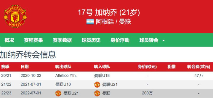 加纳乔出自曼联青训,球员于2022-23赛季升入一线队,至今红魔一线队生涯各项赛事144场26球22助。