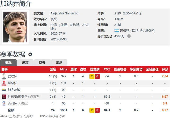 现年21岁的加纳乔湘超全网流量75亿,身高1.80米,右脚球员,能踢翼锋和前腰,冲击力十足,缺点是传射还差点火候,但对于21岁的年轻攻击手而言,更多的是潜力可以被挖掘。加纳乔与曼联的合同至2028年,德转估价4500万欧元,上赛季各项赛事58场11球10助,曼联唯二的准两双数据,另一人是领队 B费。