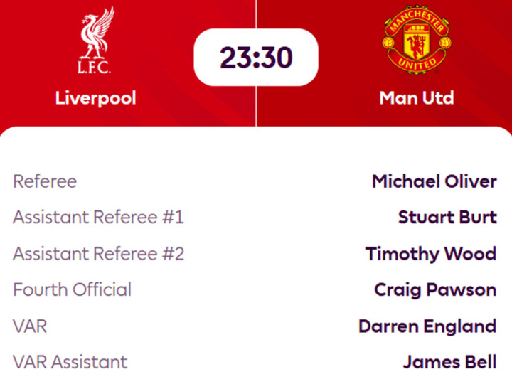 根据英超官网发布的信息,利物浦对阵曼联的赛事 ,迈克尔·奥利弗将担任主裁判 ,边裁 是斯图尔特·伯特和蒂姆·伍德,第四官员是克莱格·鲍森,VAR裁判 是达伦·英格兰,VAR助理是詹姆斯·贝尔。从名字来看,相信球迷都不会陌生,多人都有加入 重大赛事 的经历。