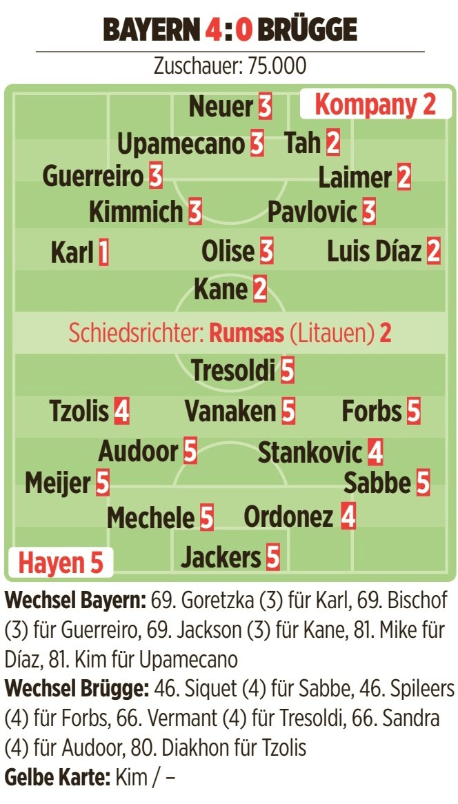 拜仁慕尼黑杆位球员 员评分:诺伊尔(3分)、格雷罗(3分)、乌帕梅卡诺(3分)、塔(2分)、莱默尔(2分)、基米希(3分)、帕夫洛维奇(3分)、卡尔(1分)、奥利塞(3分)、迪亚斯(2分)、凯恩(2分)